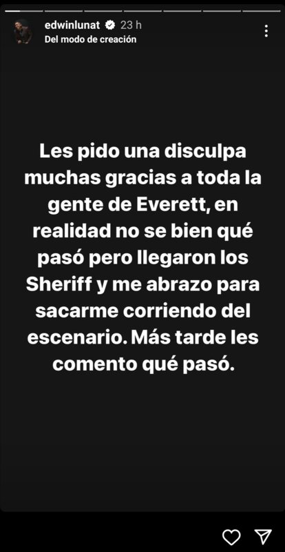 Posteriormente por medio de Instagram Edwin publicó un mensaje en la que pidió disculpas a las personas que asistieron a su concierto: