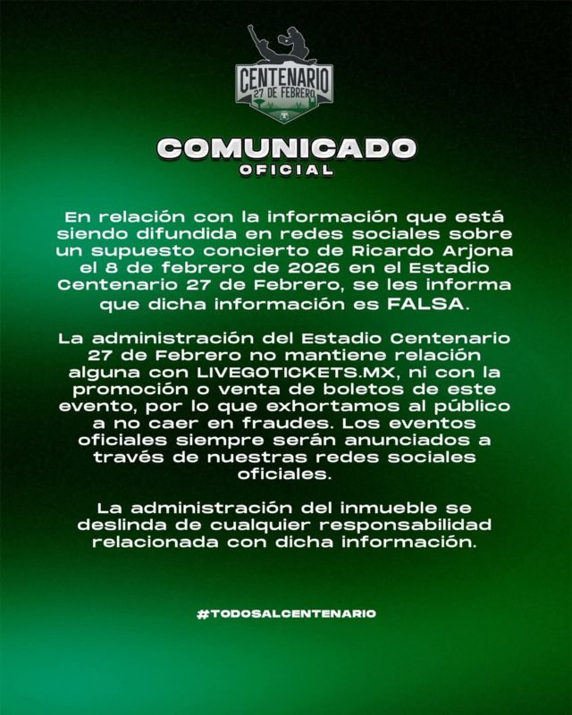 El Estadio Centenario 27 de Febrero dio a conocer sobre un concierto de Ricardo Arjona en las instalaciones del Estadio el próximo 27 de febrero de 2026 es totalmente FALSA.