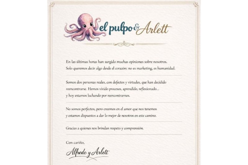 En un comunicado, ‘El pulpo’ y Arlett dan a entender que están reconciliándose, pero aclararon que no su separación anunciada previamente no se trató de una estrategia de marketing, sino que es una cuestión de “humanidad”.