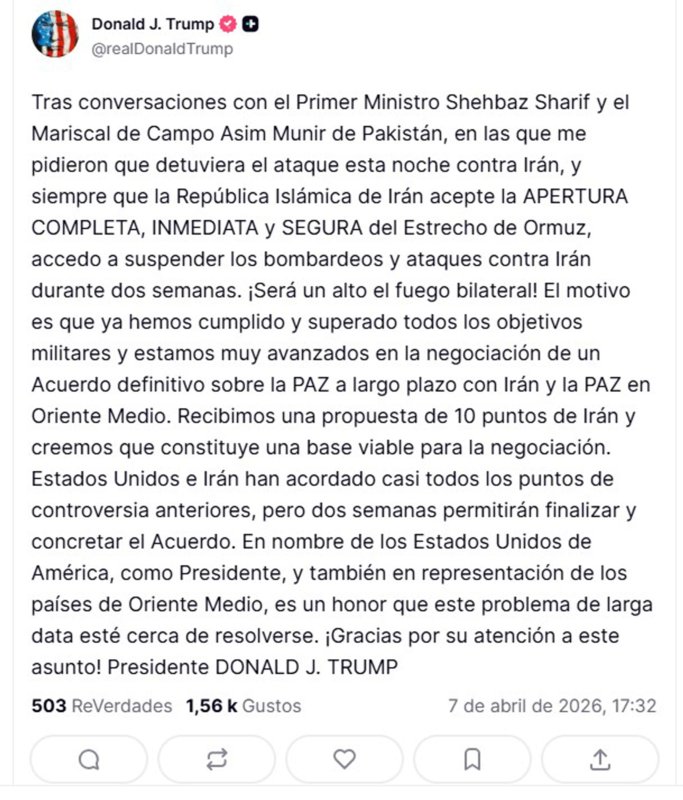 "Basándome en las conversaciones mantenidas con el primer ministro Shehbaz Sharif y el mariscal de campo Asim Munir, de Pakistán —en las cuales solicitaron que yo contuviera la fuerza destructiva que se iba a enviar esta noche a Irán—, y sujeto a que la República Islámica de Irán acceda a la apertura completa, inmediata y segura del estrecho de Ormuz, accedo a suspender el bombardeo y el ataque contra Irán por un periodo de dos semanas", escribió Trump.