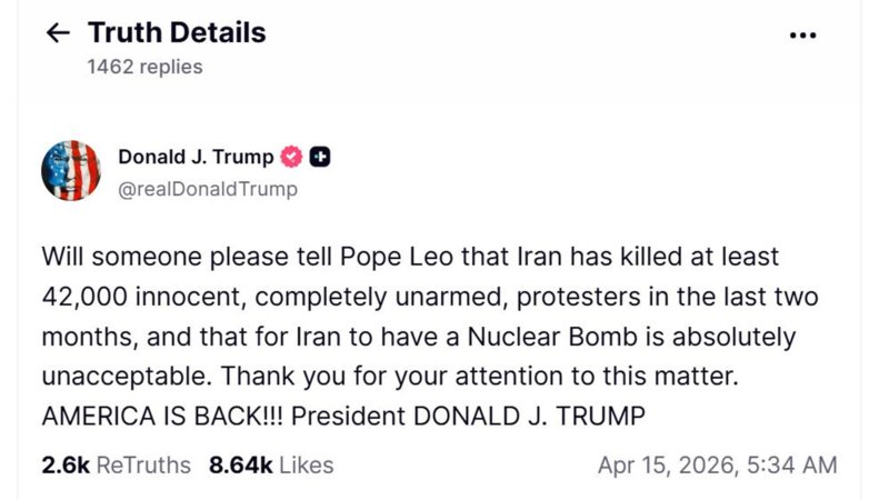 "¿Alguien puede hacer el favor de decirle al papa León que Irán ha matado al menos a 42.000 manifestantes inocentes, completamente desarmados, en los últimos dos meses, y que es absolutamente inaceptable que Irán tenga una Bomba Nuclear?", escribió Trump en su red social Truth Social.