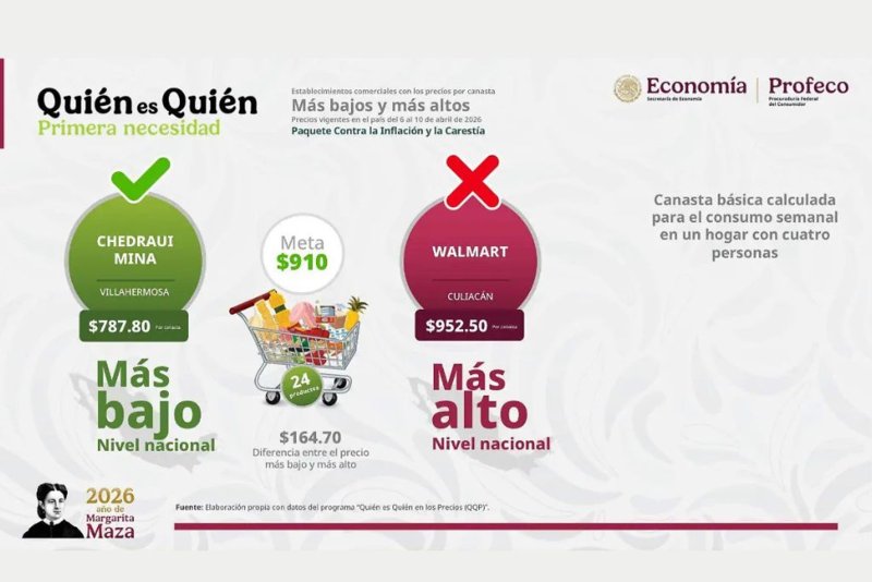En contraste, el informe reveló que la tienda con el precio más alto era Walmart, en Culiacán, Sinaloa, donde la canasta alcanzó los 952.50 pesos.