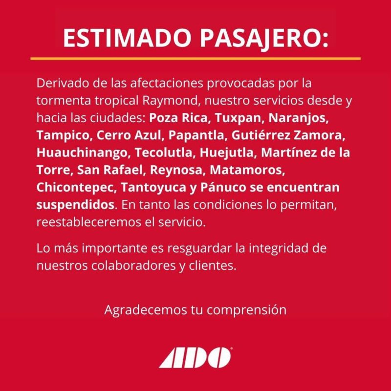 La línea de autobuses ADO informó este viernes que suspendió temporalmente su servicio en algunas ciudades de México, a causa de las afectaciones de la tormenta tropical Raymond.
