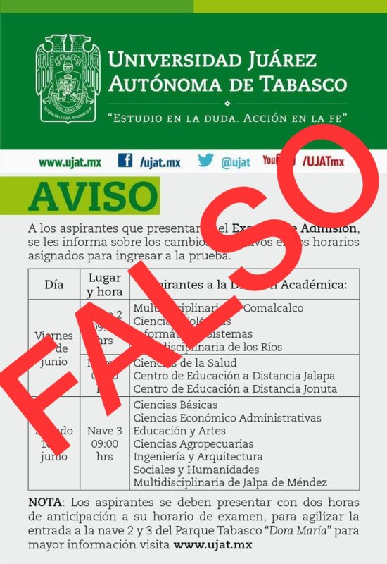 La Universidad Juárez Autónoma de Tabasco (UJAT) dio a conocer a través de sus redes sociales sobre una imagen que ha circulado en las redes sociales que es información falsa.