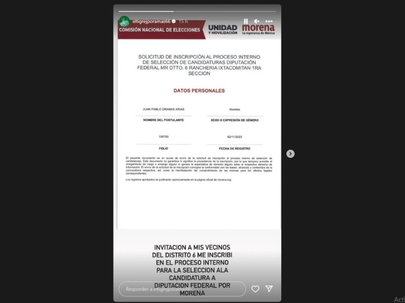 En su cuenta de Instagram, el jugador de Olmecas de Tabasco, dio a conocer que está cumpliendo con el procedimiento para representar el Distrito 6 de Tabasco, el cual está conformado por Centro, Jalapa, Tacotalpa y Teapa.
