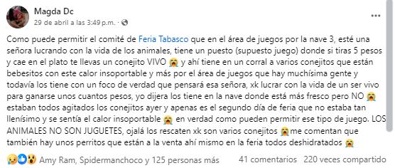 Señala que debido a esto, los encargados de los juegos tienen a varios conejos en un corral a pesar de las altas temperaturas que se registran en el estado, lo cual argumenta no debería ser permitido.