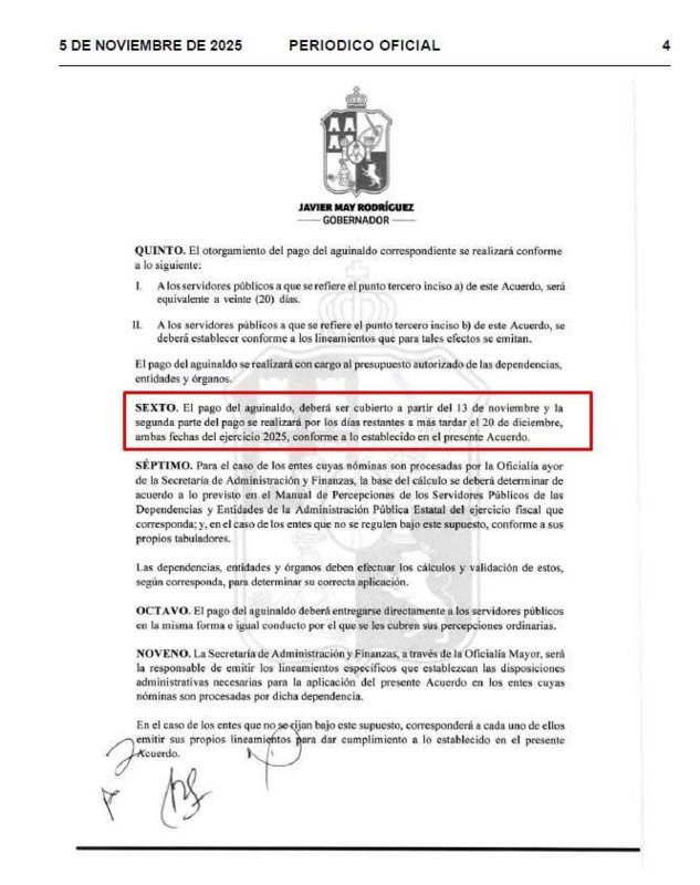 El gobierno estatal publicó en el Periódico Oficial de Tabasco el acuerdo para adelantar 20 días de aguinaldo a los servidores públicos.