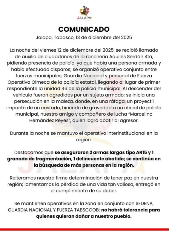 El gobierno municipal de Jalapa informó este sábado que durante la noche del 12 de diciembre, autoridades de seguridad abatieron a un sujeto armado tras una persecución que dejó un policía herido de gravedad.