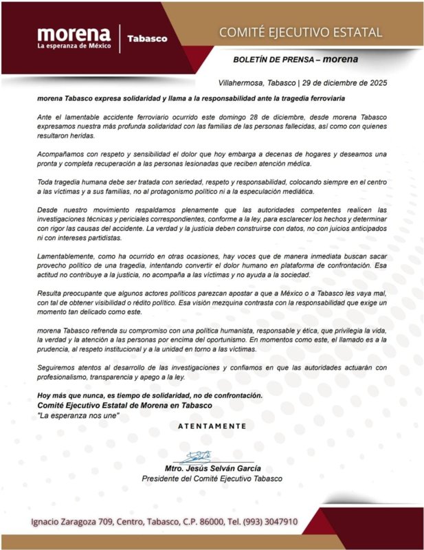El comité ejecutivo Estatal de Morena en Tabasco expresó su solidaridad con las familias de las personas fallecidas así como con quienes resultaron heridas por el descarrilamiento del tren Interoceánico, ocurrido el domingo en la localidad de Nizanda, en Oaxaca.