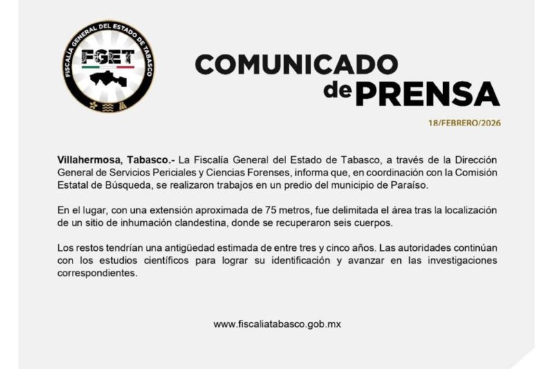 La Fiscalía General del Estado de Tabasco informó este miércoles que fue localizado en Paraíso un sitio de inhumación clandestina donde se recuperaron seis cuerpos.
