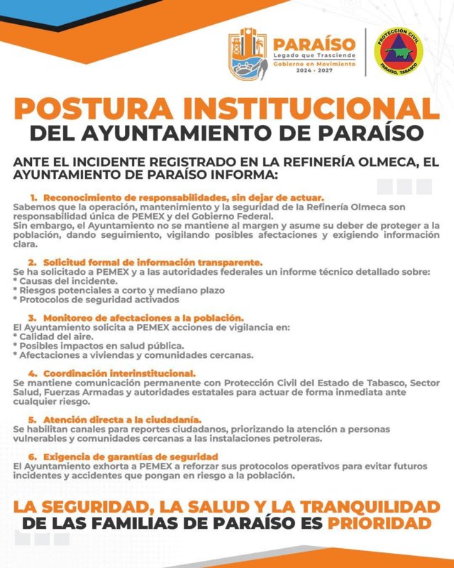 También del monitoreo ambiental y sanitario, la autoridad municipal informó que solicitó formalmente a Pemex un “informe técnico detallado” que incluya las causas del incidente, los protocolos de seguridad activados y las medidas implementadas para evitar nuevos eventos.
