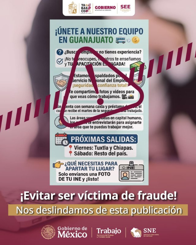 El Servicio Nacional de Empleo Tabasco informa a la ciudadanía en general, y en particular a las y los buscadores de trabajo, sobre la detección de la circulación reciente de información apócrifa relacionada con supuestas ofertas laborales que hacen uso indebido de la imagen institucional y nombres oficiales de esta dependencia.