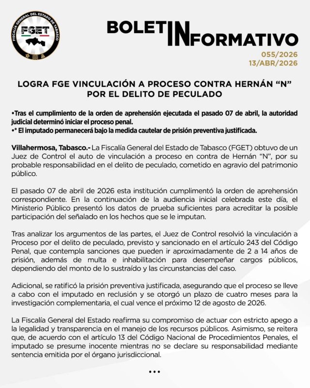 A través de un comunicado, la Fiscalía General del Estado de Tabasco (FGET) informó que obtuvo de un Juez el auto de vinculación a proceso en contra de Hernán “N”, por su probable responsabilidad en el delito de peculado, cometido en agravio del patrimonio público.