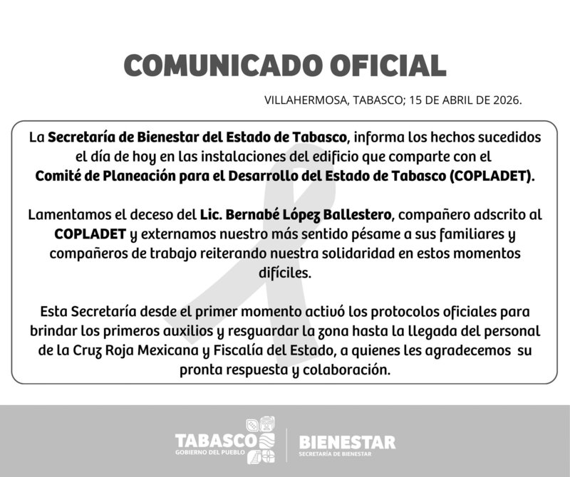 La Secretaría de Bienestar de Tabasco, informa sobre los hechos sucedidos este miércoles en las instalaciones del edificio que comparte con el Comité de Planeación para el Desarrollo del Estado (COPLADET).