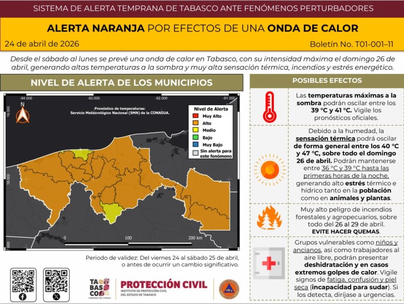 El Instituto de Protección Civil del Estado de Tabasco (IPCET), dio a conocer que desde este 25 al 27 de abril, se se prevé una onda de calor en Tabasco, lo que ha llevado a la activación de la alerta naranja debido a las altas temperaturas que se esperan en la entidad, con su punto máximo el domingo 26 de abril.