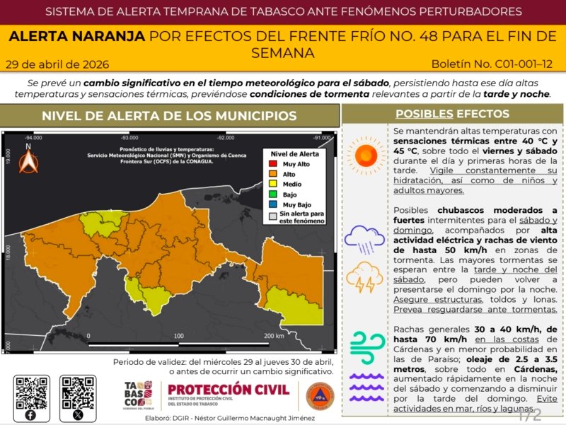 El Instituto de Protección Civil del Estado de Tabasco (IPCET) emitió una alerta naranja ante la llegada del Frente Frío número 48, fenómeno que provocará un cambio drástico en las condiciones meteorológicas durante este fin de semana.