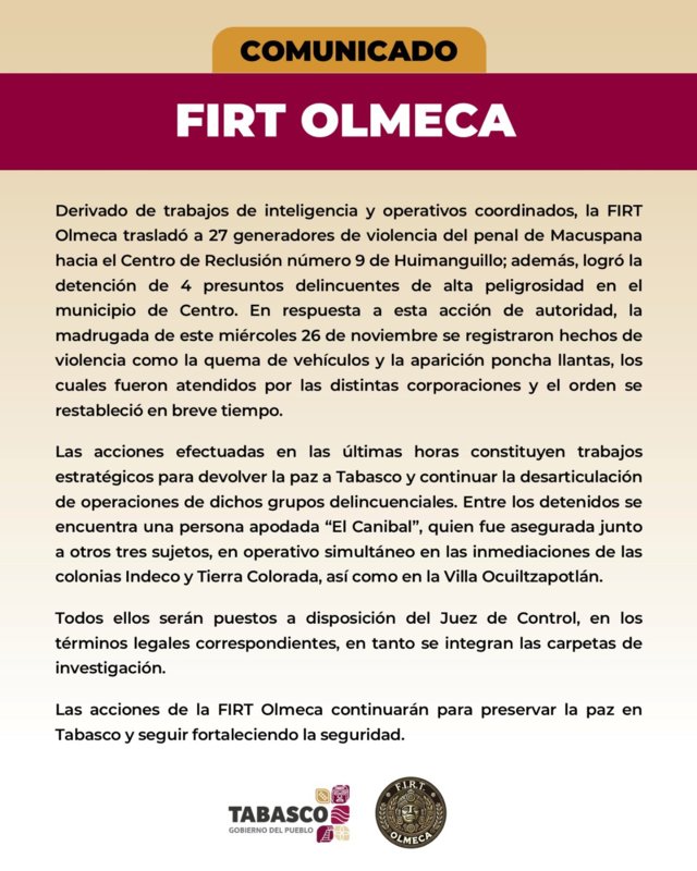 La FIRT Olmeca, a través del gobierno de Tabasco, informó este miércoles que logró la detención de 4 presuntos delincuentes de alta peligrosidad en el municipio de Centro.