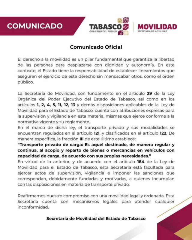 La Secretaría de Movilidad de Tabasco subrayó este martes que el transporte en la entidad debe realizarse de manera legal y ordenada para garantizar la seguridad de la población, y la dependencia está facultada para hacer cumplir la ley de movilidad estatal.