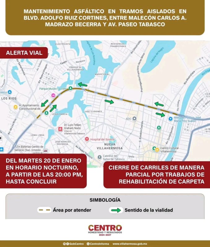 El Ayuntamiento de Centro emitió una alerta vial que desde este martes 20 de enero, a partir de las 8 de la noche y hasta concluir; se realizarán trabajos de mantenimiento asfáltico en horario nocturno en la Avenida Adolfo Ruiz Cortines.