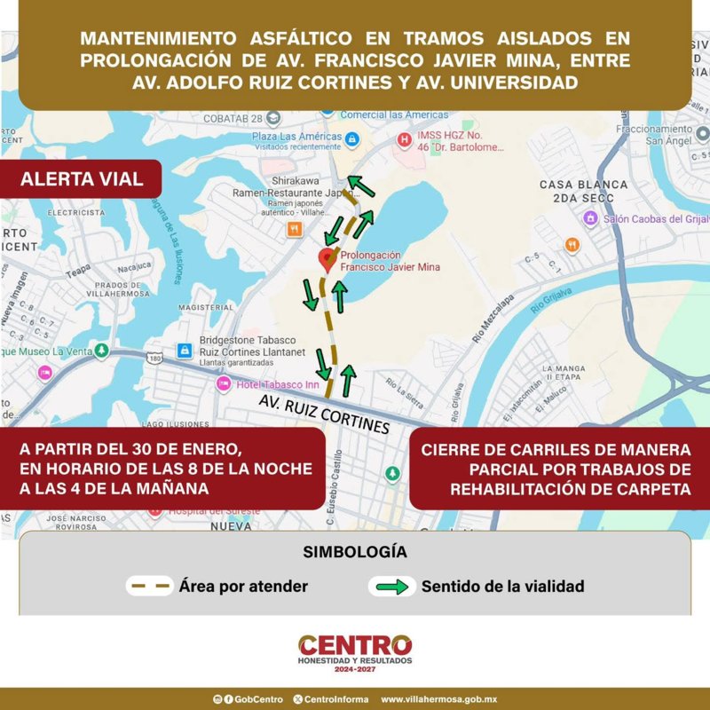 El Ayuntamiento de Centro informó que, a partir de este viernes 30 de enero y hasta su conclusión, se hará el cierre parcial de carriles en tramos aislados de la prolongación de la Avenida Francisco Javier Mina, por labores de mantenimiento asfáltico: