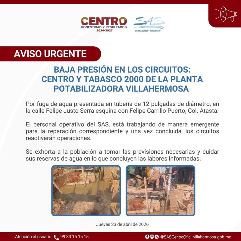 El Sistema de Agua y Saneamiento (SAS) informó que los circuitos Centro y Tabasco 2000, abastecidos por la Planta Potabilizadora Villahermosa, operarán con baja presión debido a una fuga de agua registrada en una tubería de 12 pulgadas de diámetro.
